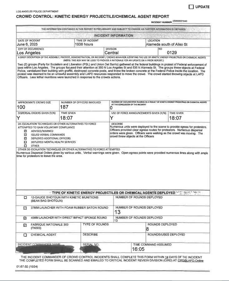 Crowd Control: Kinetic Energy Projectile/Chemical Agent Report (June 6, 2025 Central)